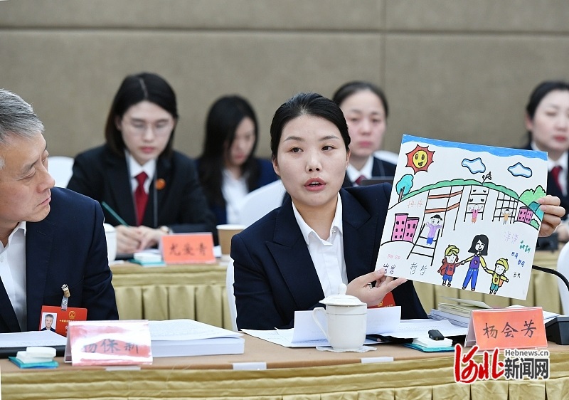 3月10日,在河北省代表团分组会议上,杨会芳代表向大家展示了孩子们为她画的画。河北日报记者 张晶摄