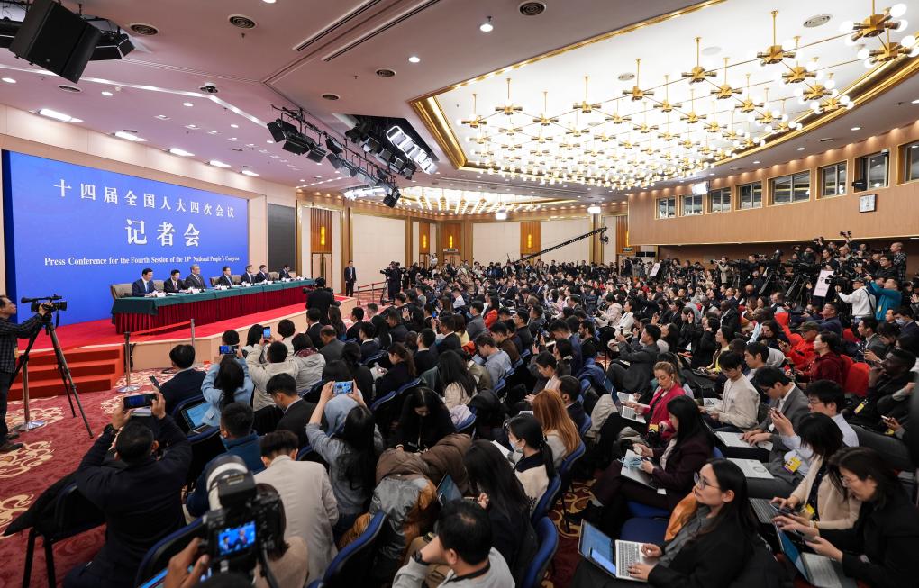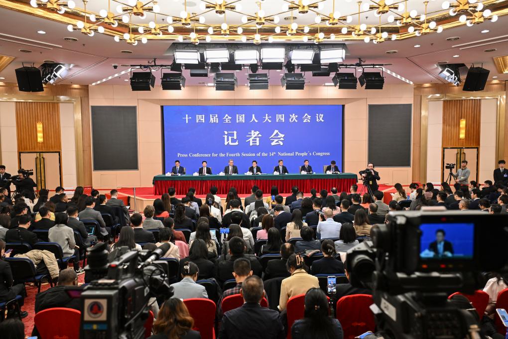 3月6日,十四届全国人大四次会议在北京梅地亚中心新闻发布厅举行记者会。国家发展和改革委员会主任郑栅洁、财政部部长蓝佛安、商务部部长王文涛、中国人民银行行长潘功胜、中国证券监督管理委员会主席吴清就发展改革、财政预算、商务、金融证券等相关问题回答中外记者提问。新华社记者 曹祎铭 摄