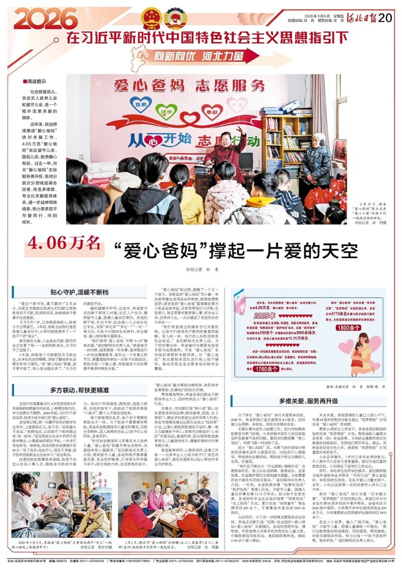 近年来,我省持续推进“爱心爸妈”结对关爱工作,4.06万名“爱心爸妈”走近留守儿童、困境儿童,提供暖心帮扶。过去一年,河北“爱心爸妈”志愿服务再升级,各地分层次分领域招募志愿者,完善多维度、专业化关爱服务体系,进一步延伸帮扶链条,助力更多孩子与爱同行、向阳成长。