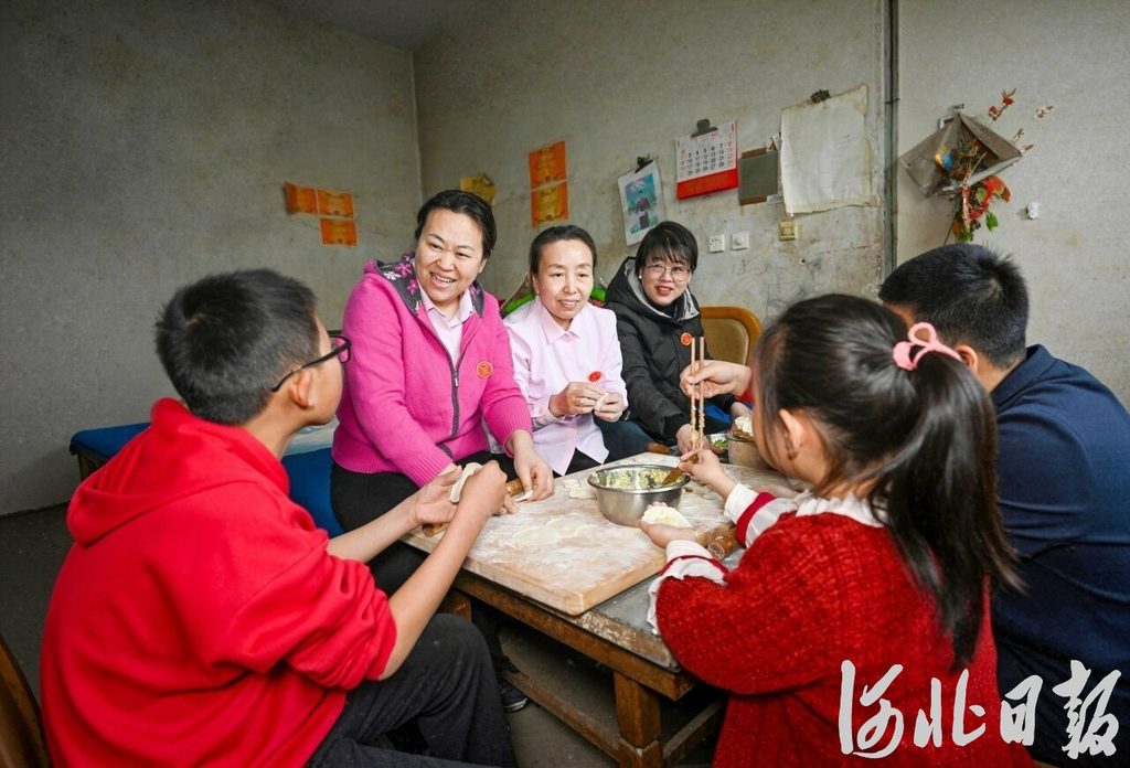 3月1日,衡水市“爱心妈妈”刘艳梅(左二)、居春萍(左三)、彭娜(左四)来到孩子们家中一起包饺子。河北日报记者 张昊摄