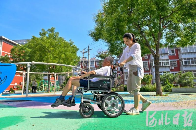 2025年7月4日,邯郸市复兴区阳光里棉三小区,社区工作人员陪伴行动不便的居民在进行了适老化改造的场地上活动。(资料片)河北日报记者田明摄