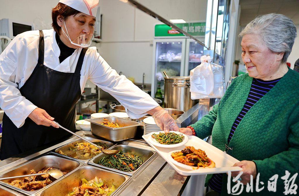 居民在秦皇岛市海港区万和城社区的颐港湾居家养老服务中心社区食堂打饭菜。(河北日报资料片)河北日报记者孙也达摄